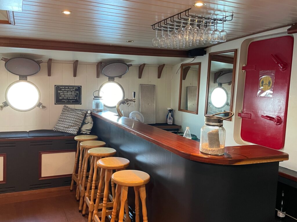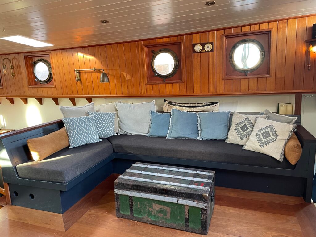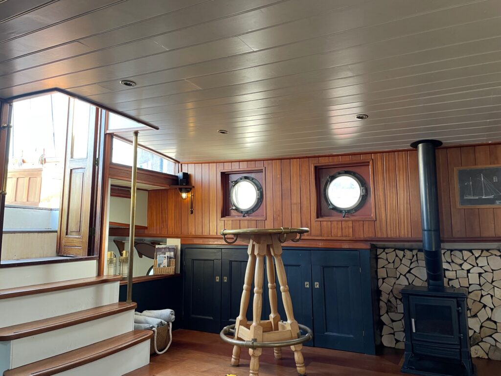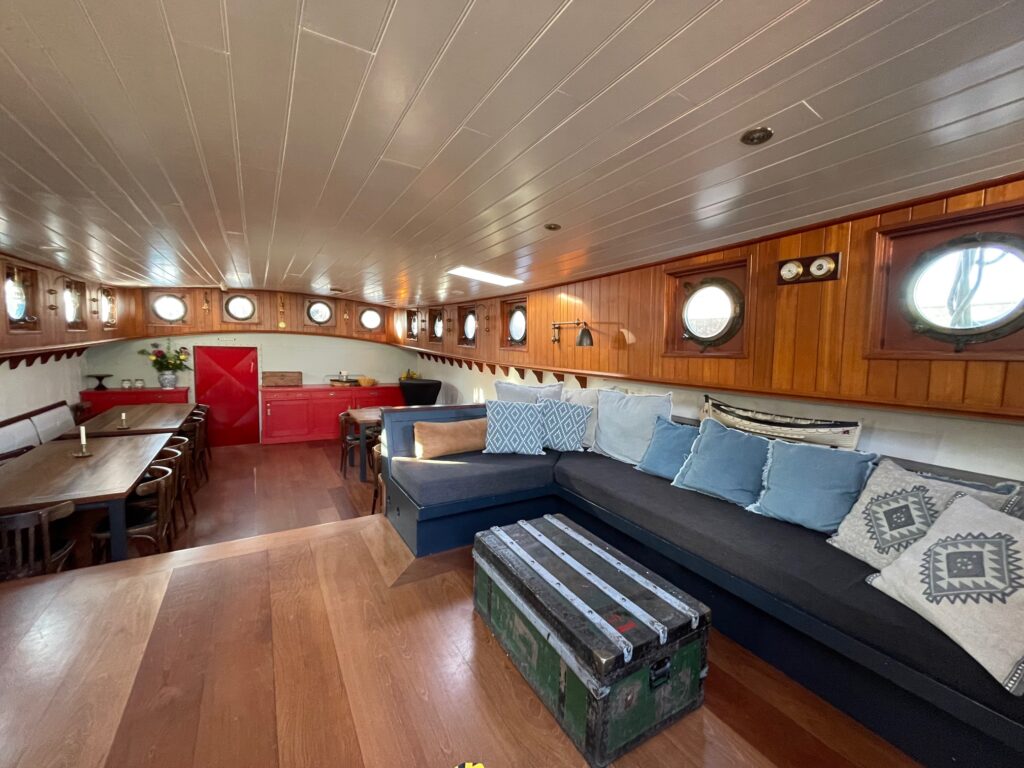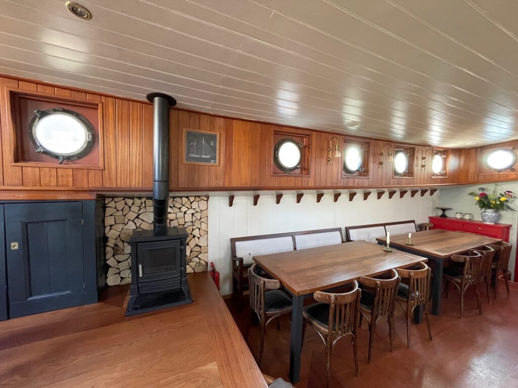 Neem binnen plaats aan de grote houten eettafels, of in de leuke loungehoek bij de authentieke oliekachel. Ook in de bar, waar je door de grote patrijspoorten op de waterlijn ook binnen een kijkje op en soms zelfs onder water water hebt, is het erg gezellig . Het sanitair is ruim opgezet met aparte toiletten voor dames en heren. Tot slot is er een grote keuken waar alle gerechten vers worden bereid.